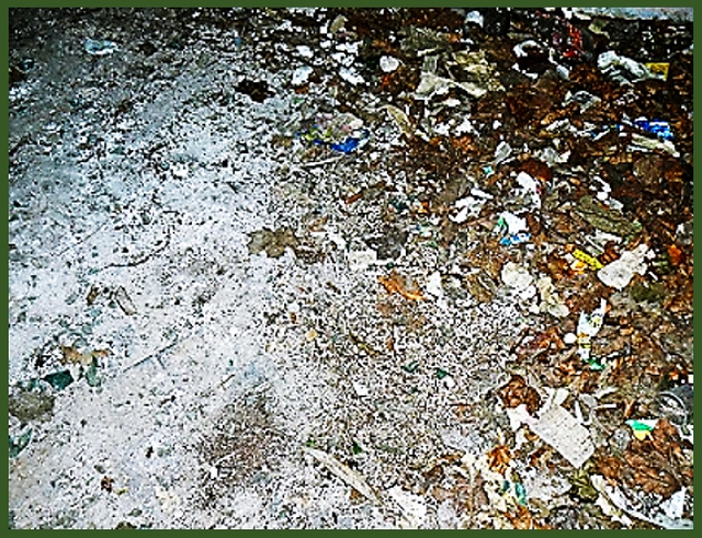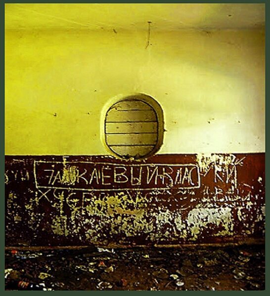 Этот спрятавшийся за кустом овал, когда-то был окном, т.к. внутри здания на его месте заколоченная досками дырка. А пол, как и в предыдущих строениях, покрыт слоем мусора.