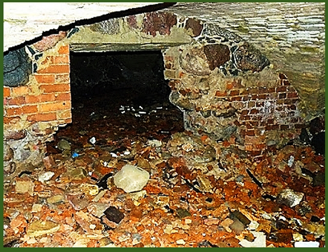 Осторожно обходя фекалии спускаемся в подвал. Он, как и само здание, состоит из двух комнат. Некогда просторное помещение завалено битым кирпичом и мусором на столько, что стоять в нем можно только низко пригнув голову.