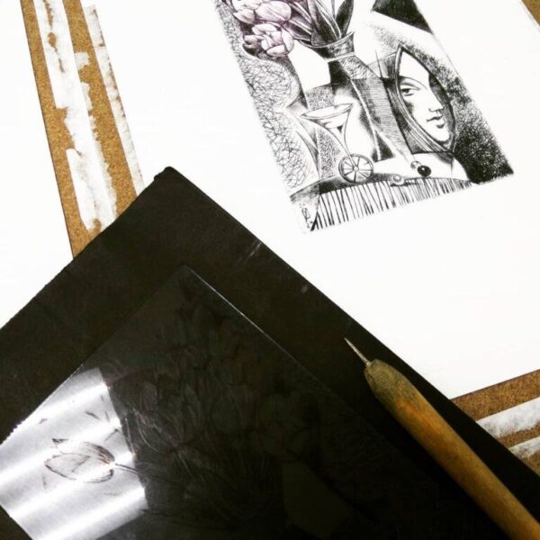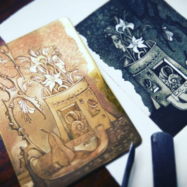 — Художники работают в разных техниках. Какая ближе вам? Какие жанры предпочитаете?— Я работаю в разных техниках: это и живопись маслом, и акварель. Но ближе всего мне офорт — это такой вид гравюры. Что касается жанров, то это натюрморт, пейзаж, фигуративные композиции.Ещё когда учился на худграфе, у нас был курс печатной графики. После учёбы не было возможности заниматься серьёзно, но было большое желание и мечта. В 2000 году, благодаря помощи коллеги, большого профессионала, начал работать в технике гравюры.Процесс создания работ здесь достаточно длительный и трудоёмкий. Медная или цинковая пластина покрывается кислотоупорным лаком. На неё переводится рисунок и гравируется. После этого необходимо рисунок протравить, очистить от лака. Следующий этап — печать. Необходимо в углубления «забить» краску и перенести краску с доски под давлением на бумагу при помощи специального офортного станка. С одной пластины можно отпечатать достаточно большое количество экземпляров, которые являются произведениями автора.
