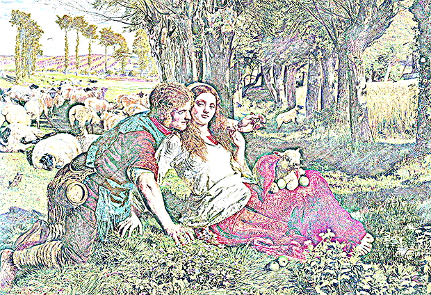 Быў у пана пастух, прыгожы хлопец, які любіў людзей i прыроду, бо ўсё жыццё жыў сярод ix. Бачыў i разумеў ix дабрату i ласку. Калі надышлі для яго патрэбныя гады, прыйшло да хлопца i першае каханне.