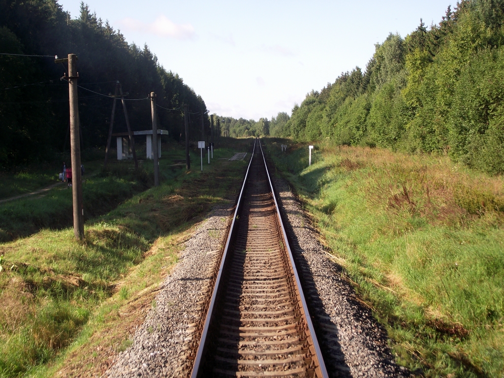 6. А поезд наш едет по белорусской глубинке, среди деревень, исправно останавливаясь у каждого столба. Как, кстати, и по пути туда. Кроме него по этой линии ходит ещё дизель Полоцк — Поставы. А вот на друйской ветке пригородного сообщения нет — только прицепные вагоны из Витебска и Минска. Мы сначала собирались проехать обе ветки целиком и побывать и в Лынтупах и Друе, но я не смог получить пропуск в белорусскую погранзону (там он, в отличие от России, требуется только гражданам других государств). Ближе к Лынтупам есть интересная остановка (бывшая станция) Годутишки, где железная дорога вплотную соприкасается с границей.